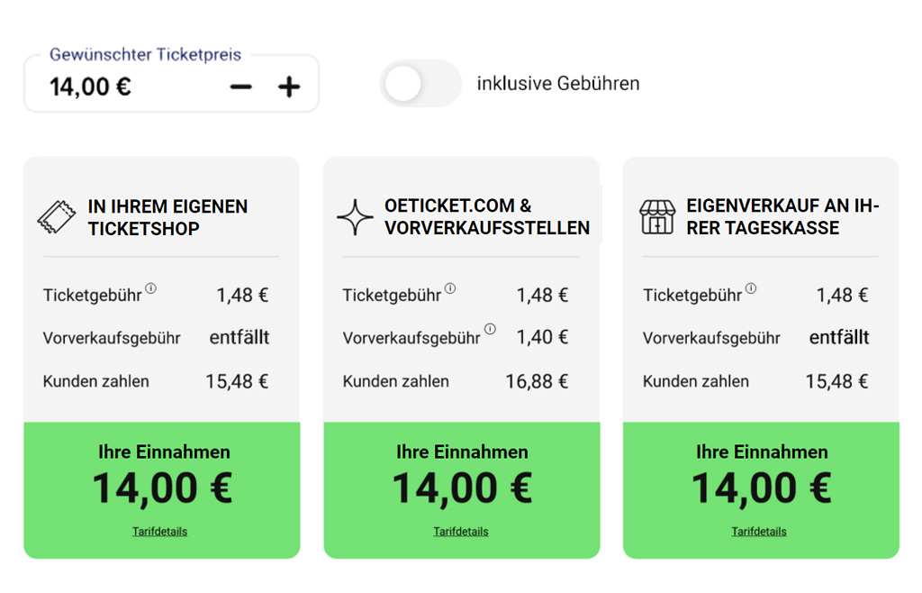 Nutzen Sie unseren Ticketpreisrechner, um Ihre Ticketpreise unverbindlich zu kalkulieren und Ihre eigenen Einnahmen jederzeit im Blick zu behalten.